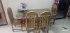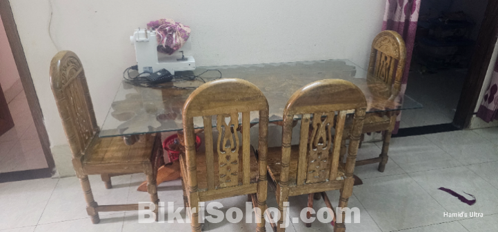 সেগুন কাঠের ডাইনিং টেবিল চারটা চেয়ার সহ। উপরে ১৪ মিলিম গ্লাস দেওয়া।