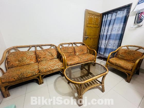 মোটা বেতের মজবুত সোফা,২ সিট্ এর ২ টি, ১ টি সিঙ্গেল সিট্ এর সোফা ও ১ টি সেন্টার টেবিল ।