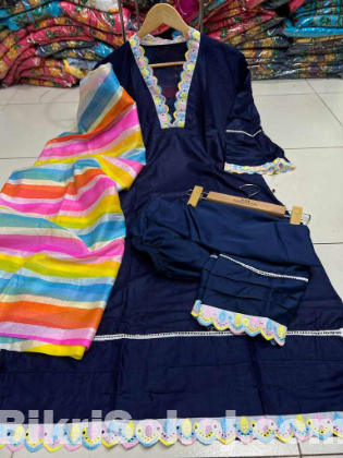 সেলোয়ার:-ইন্ডিয়ান বাটার সিল্ক।। সেলাই করা থাকবে, ফ্রি সাইজ।। সালোয়ারের নিচে এমব্রয়ডারি লেসের কাজ করা থাকবে।।