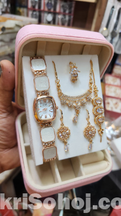 কমপ্লিট সেট: একটি মাত্র অর্ডারে ঘড়ি ও পূর্ণ জুয়েলারি সেট (নেকলেস, ২ জোড়া কানের দুল, ব্রেসলেট, আংটি)।