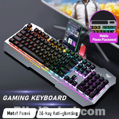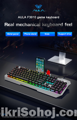 The AULA F3010 Membrane Gaming Keyboard equipped with Metal panel, scratch resistant. Unique appearance design, with mobile phone holder, work and life are not wrong. The mixed color luminescence shows its elegant temperament and humanized function. For create a quiet environment, it consists elastic silica gel noise reduction technology for their users. It has support driver, can customize function, save configuration function to computer. AULA F3010 is two-color injection molded keyboard with Multimedia function's FN key. Its compatible with WIN XP/WIN7/WIN8/WIN10 operating system. This AULA F3010 Membrane Gaming Keyboard has 01-year warranty.