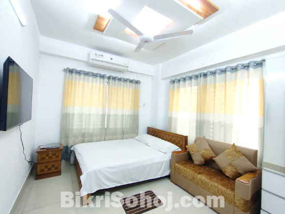 Luxurious 1BHK Furnished Apartment for Rent in Bashundhara R/A. Experience premium living with our fully furnished 1BHK apartments. Each unit comes with a kitchen, TV, geyser, refrigerator, WiFi, microwave and air conditioning.