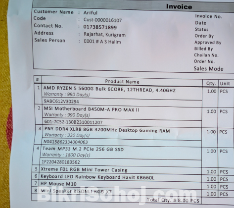 Proccesor : Amd Ryzen 5600g Motherboard : msi Ram: 8 Ssd: 256 gb Monitor: 22" inch. Unv brand Keyboard : havit lighting Mouse: A4 tech Rgb cassing