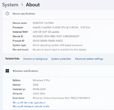 Processor: Intel(R) Core(TM) i5-4590 CPU @ 3.30GHz 3.30 GHz RAM: 4.00 GB System type: 64-bit operating system, x64-based processor Version: 23H2 SSD: 256gb_ T253T1240G0C101 Monitor: Starex (IPS19") Warranty Available 6 Months Keyboard: A4Tech Mouse: A4Tech UPS: KSTAR (Double Battery) আগ্রহীরা মেসেজ করতে পারেন। ঠিকানাঃ ঝুটিতলা মোড়, কাটিয়া, সাতক্ষীরা সদর, সাতক্ষীরা।