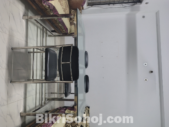 ১টি গ্লাস এর ৬চেয়ার এর ডাইনিং টেবিল, টেবিলের টপ 10mm glass, ফ্রেম মজবুত এসএস এর আর সাথে ৪তা চেয়ার এসএস প্লাস পিইউ লেদার।