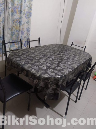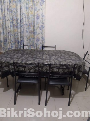 Melamine board dining table top and rod iron frame. Is in good condition. 6 pcs dining chair with foam seat. good condition