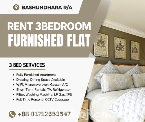 Furnished 3BHK Serviced Apartment RENT in Bashundhara R/A. Short-Term Rentals are available with Kitchen, TV, Geyser, Refrigerator, WiFi, Microwave oven, A/C.