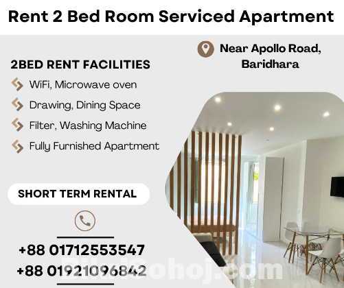 Furnished 2 Bedroom Serviced Apartment RENT in Baridhara. Short-Term Rentals are available with Kitchen, TV, Geyser, Refrigerator, WiFi, Microwave oven, A/C.