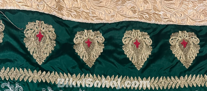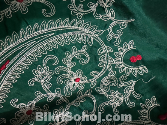 Kantha, the famous weave of bengal, known for its intricate and rich embroidery is vividly reflected on this green colored pure silk woven saree.