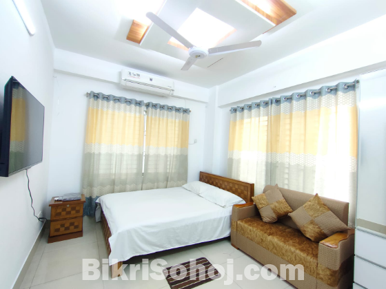 Rent Furnished One Bedroom Apartment for a Premium Experience in Bashundhara R/A. Short-Term Rentals are available with Kitchen, TV, Geyser, Refrigerator, WiFi, Microwave oven, A/C.