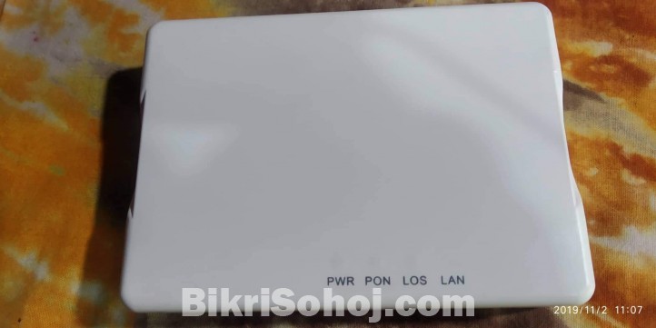 BD.COM ONU has 1GE optical network, PON uplink port, RJ-45 ethernet port, 10/100/1000Mbps, connect to external AC-DC adapter, power on/off.