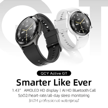 QCY Active Gt specifications: Display Type: AMOLED HD Size: 1.43 inches Resolution: 466 x 466 pixels Refresh Rate: 60Hz Features: Always-On Display, manual brightness control, and customizable watch faces Design and durability Materials: Zinc alloy bezel, stainless steel crown, and nano-ceramic shell Water Resistance: 3 ATM (suitable for swimming) Strap: 22mm silicone strap with a metal buckle Health and fitness Workout Modes: Supports over 100 sports modes, including cycling, jogging, and yoga Health Tracking: Heart rate monitoring, sleep tracking, SpO2 monitoring, and stress monitoring Battery Capacity: 300 mAh Battery Life: Up to 12 days (daily use) and 7 days (heavy use) Connectivity and features Bluetooth Calling: Yes, for hands-free communication App: Connects to the QCY App Other features: Notifications, music control, and customizable watch faces via the app