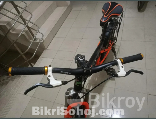 Model no.Scorpion Master 3.0 Disk.Suspension, Disc brake, single free wheel, 20 inch tyre size, Orange and black color.