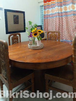 আকার : ৫৫ইঞ্চি ব্যাস, গোলাকার, সাথে ৪ টি সেগুন কাঠের চেয়ার থাকবে। নিচে গোল স্টোরেজ আছে,বেশ অনেক জিনিস রাখা যায়।