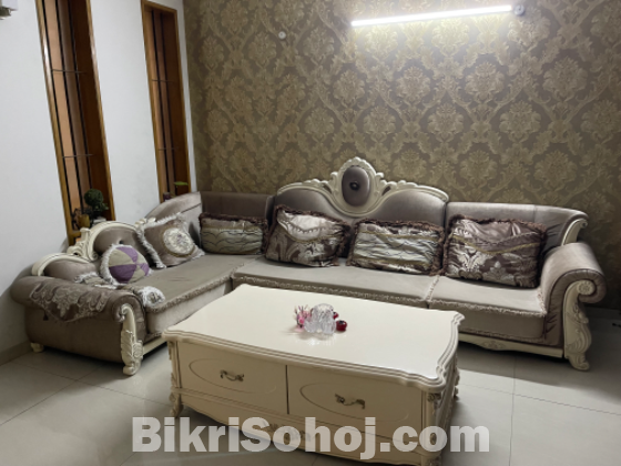Sofa sets with central table. Made of wood. Center table has 4 drawers.