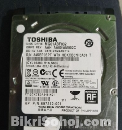 Toshiba MQ01ABF032 320GB 5400 RPM Internal Laptop Hard Disk Drive, 1 x SATA III 6 Gb/s, 7-pin Serial ATA-600 storage Interface, 2.5" form factor, 2.7 x 3.9 x 0.3 inch dimension, 0.55 Watt / 1.5 Watt power consumption, made in Philippines.
