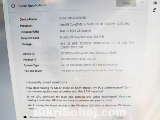 Intel core i5, Ram16gb,hdd932gb,ssd112gb